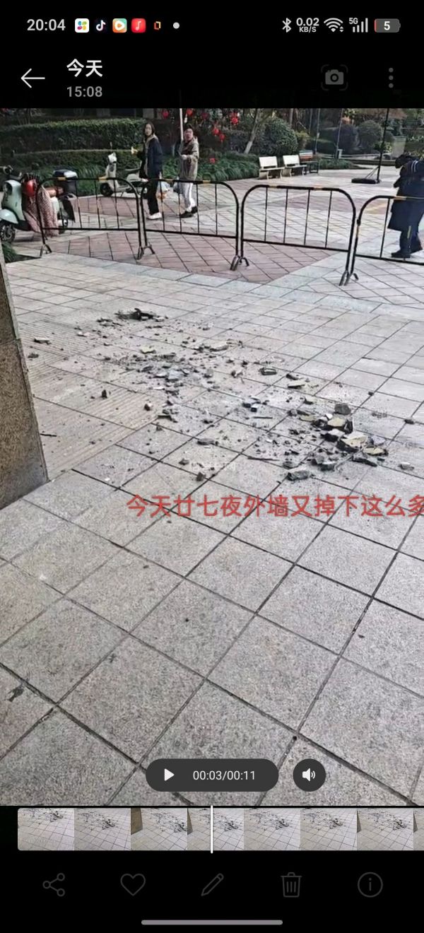 我是柯桥区金色水岸小区业主,今天我们小区8号楼出入大门口处,又再次次发生了外墙水泥粉刷层大面积脱落的情况。轰的一声巨响,掉下来的水泥块砸在地上四分五裂,最大的比巴掌大。这已经是小区交房以来很多次脱落了! 而脱落的位置,正是我们每天进出必经的单元大门口。