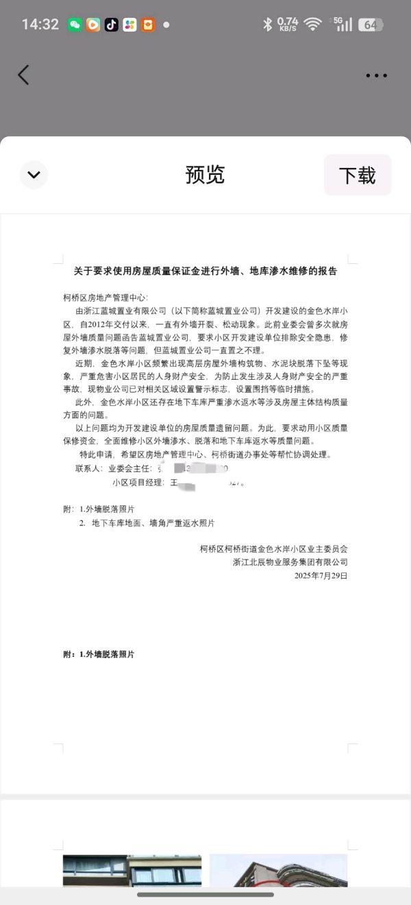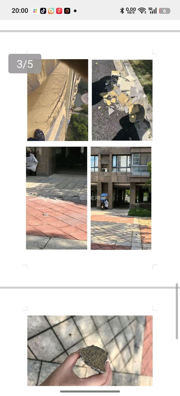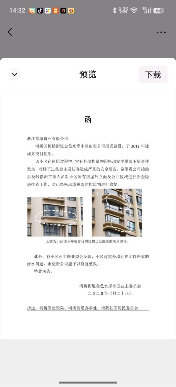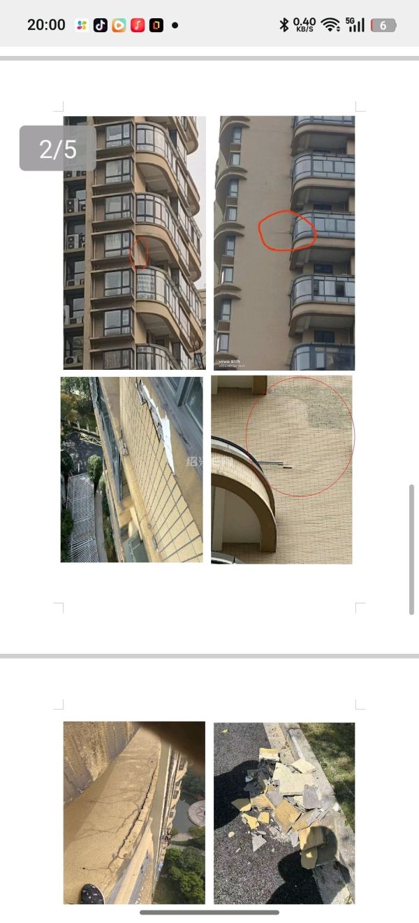关于这个严重的安全隐患,我们小区业委会和物业公司并没有坐以待毙。早在5年前向贵单位(柯桥区房管部门)打报告、递交申请,请求动用当初开发商押在政府手里的房屋质量保证金,来彻底维修这栋楼频繁脱落的外墙。