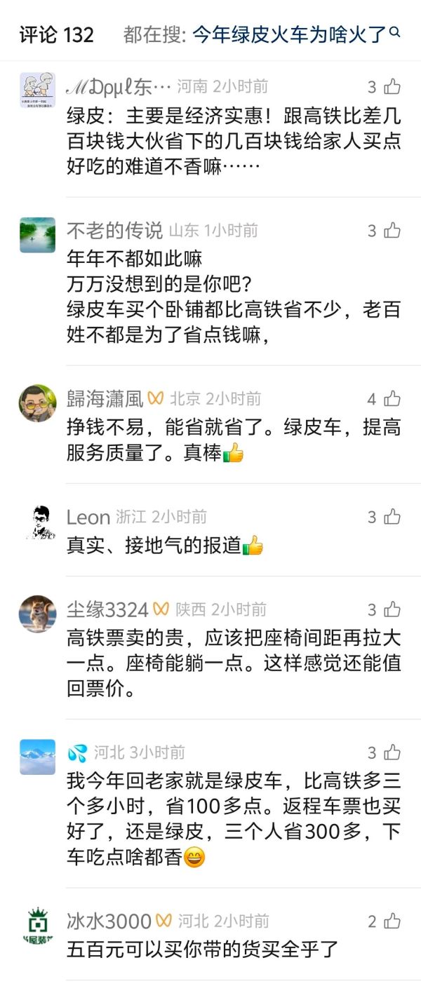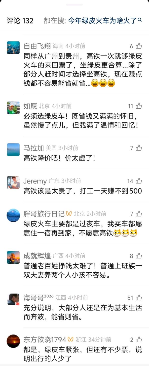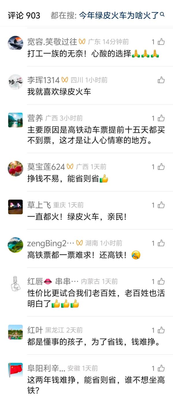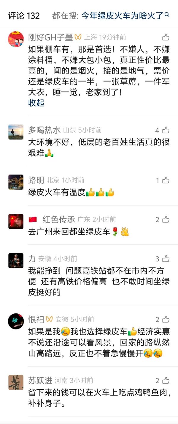 这还需要问原因啊,就现在这种大环境,钱难赚啊,老百姓穷啊,绿皮车比高铁便宜,能省一点是一点,