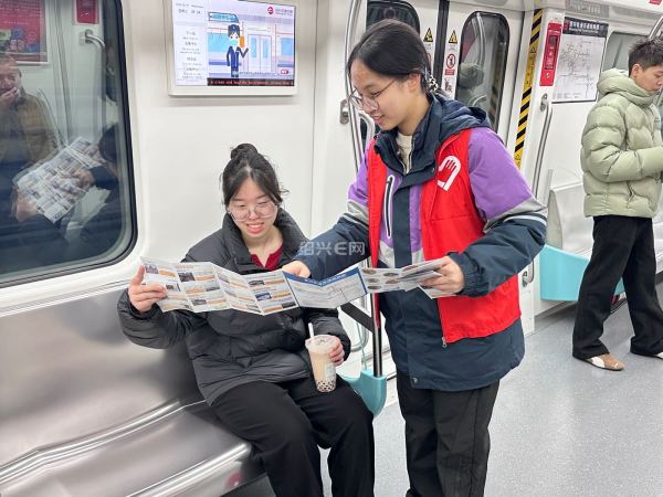 在地铁1号线支线的会展中心站,同学们认真接受讲解员培训,快速掌握地铁服务要领,进入地铁车厢,化身志愿小帮手,做好文明引导,线路指引,贴心服务,让青春力量温暖回家路。