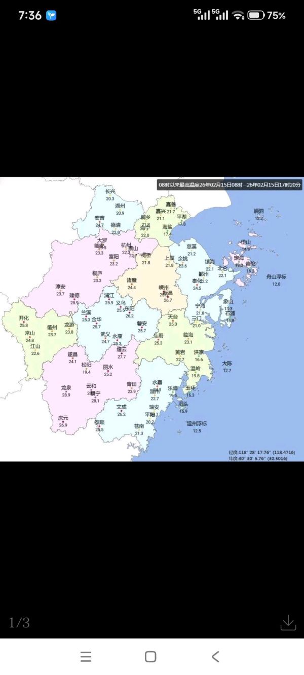 暖似阳春三月,处于升温通道中,昨天白天在阳光的助力下,气温爬升势头迅猛,最暖的新昌冲到了26.7℃,其次是嵊州,为25.8℃,可谓是暖到极致了。