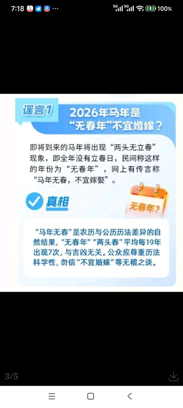北京网络举报发文辟谣称,事实上,“马年无春”是农历与公历历法差异的自然结果,“无春年”“两头春”平均每19年出现7次,与吉凶无关。