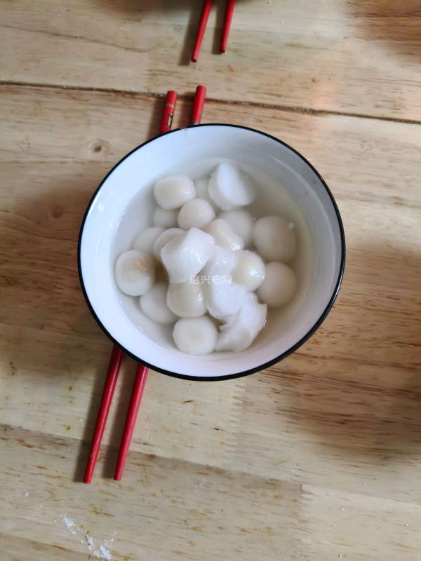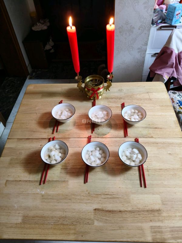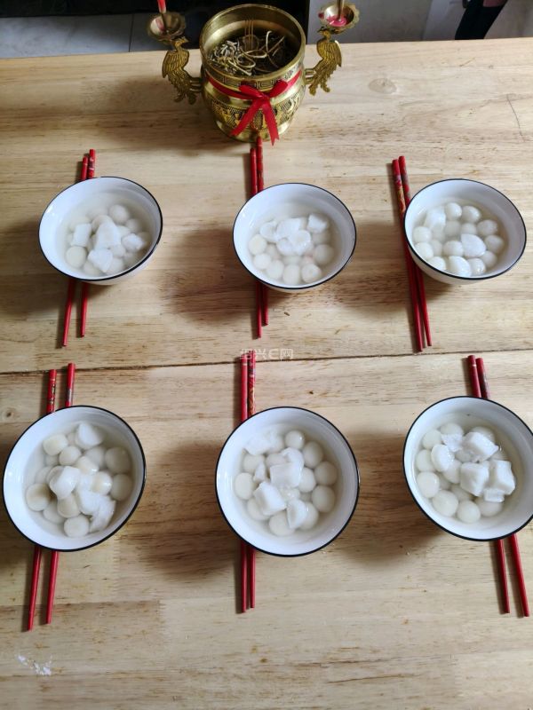 昨晚搓好的吞吞,再加上切成小块的年糕,盛成六碗,里面加上白糖,点上蜡烛向菩萨祈福,祈愿全家老少在新的一年里平安、健康、快乐、顺遂