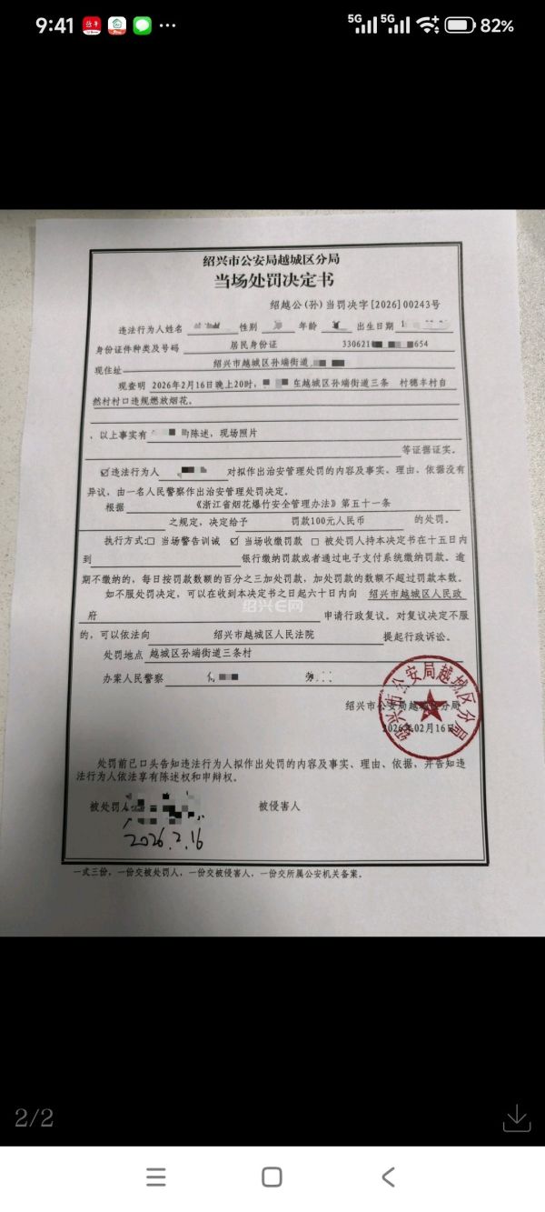 2026年2月16日(除夕)晚上20时许,绍兴滨海新区孙端街道应消站工作人员和派出所民警在巡查过程中发现,樊浦村村民沈某在三条溇村(属于烟花爆竹禁放区域)一民房院子内燃放烟花爆竹,附近均为居民楼,易引发火灾。