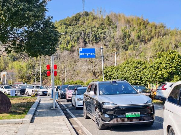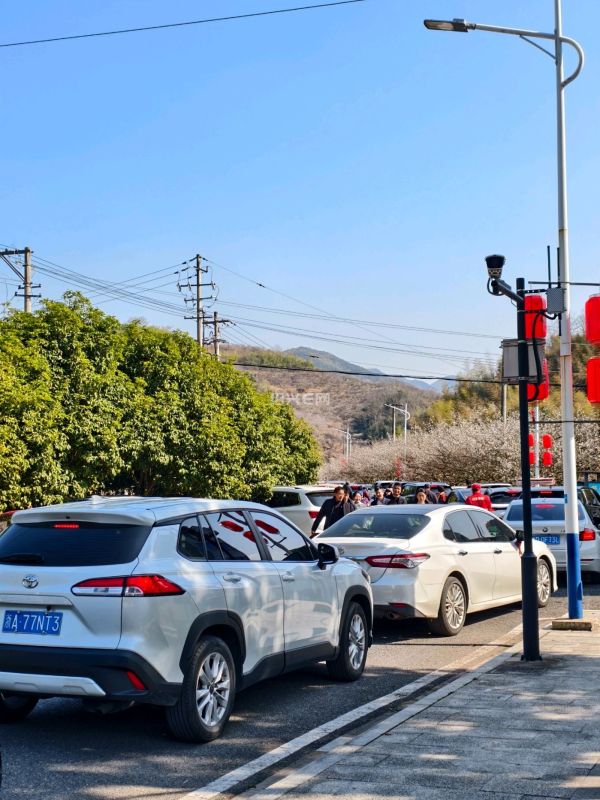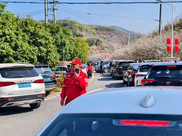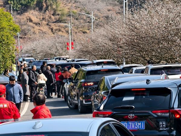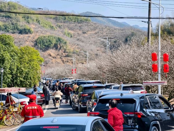 正月初二,柯桥区王坛镇东村香雪梅海进入盛花期,大批市民自驾前往。沿线车流密集,进村道路出现拥堵,交警现场疏导,提醒市民错峰绿色出行。