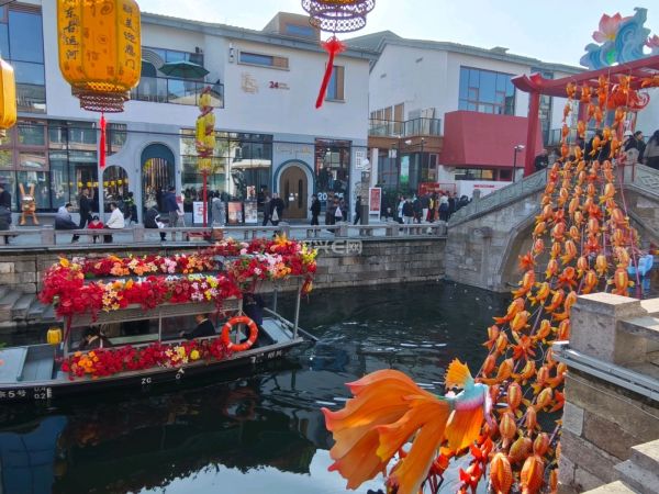 这年味,是铺天盖地的红。青石板路不知何时已铺上了厚重的红地毯,一直延伸向水街深处。城楼的飞檐下,宫灯高悬,与桥头的彩带、铺面的饰物交相辉映,将白墙黛瓦的江南风情染上了一层喜庆的暖意。街角处,造型各异的吉祥小品更是点睛之笔:昂首的骏马寓意“马上有钱”,憨态可掬的鲤鱼象征“年年有余”,还有那金光闪闪的财神爷,正笑呵呵地迎接着八方来客。目光所及,尽是热烈的红色,那是中国人骨子里对新岁最质朴的祈愿。