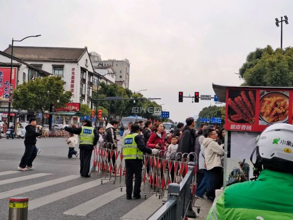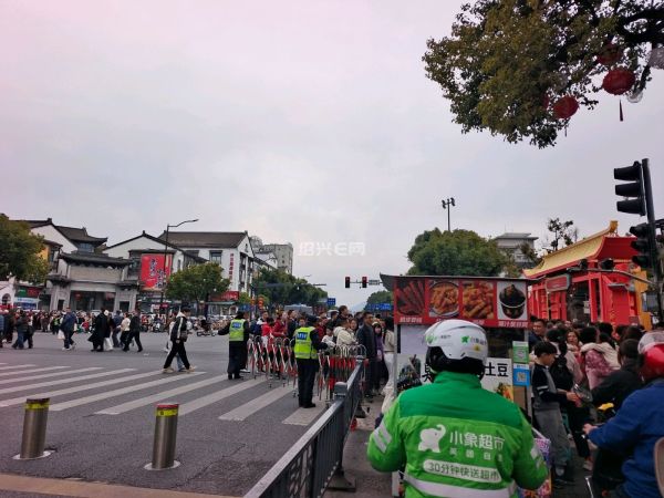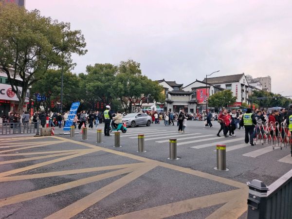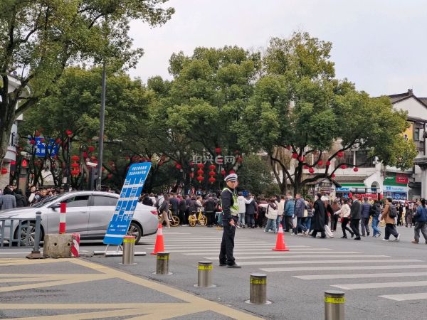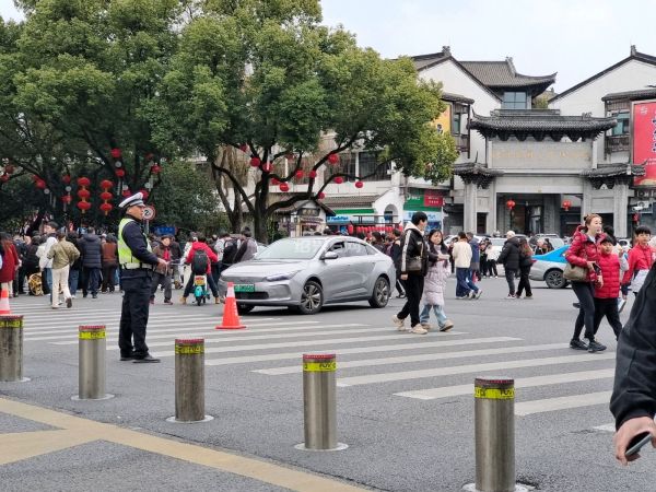春节假期,鲁迅故里十字路口的电动桩又启用了,红灯时升起,绿灯是放下,配合隔离栏,让游客有序通过。