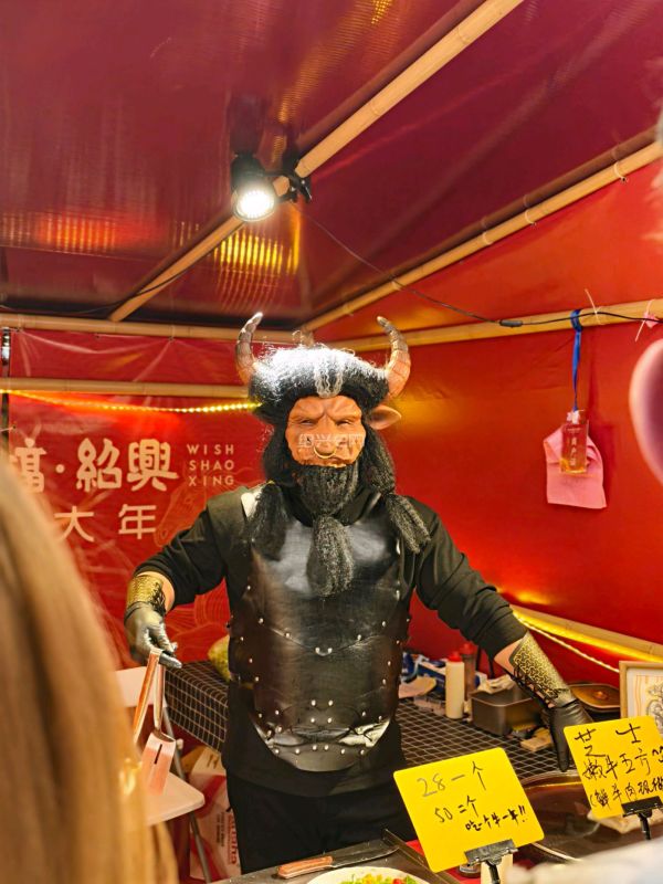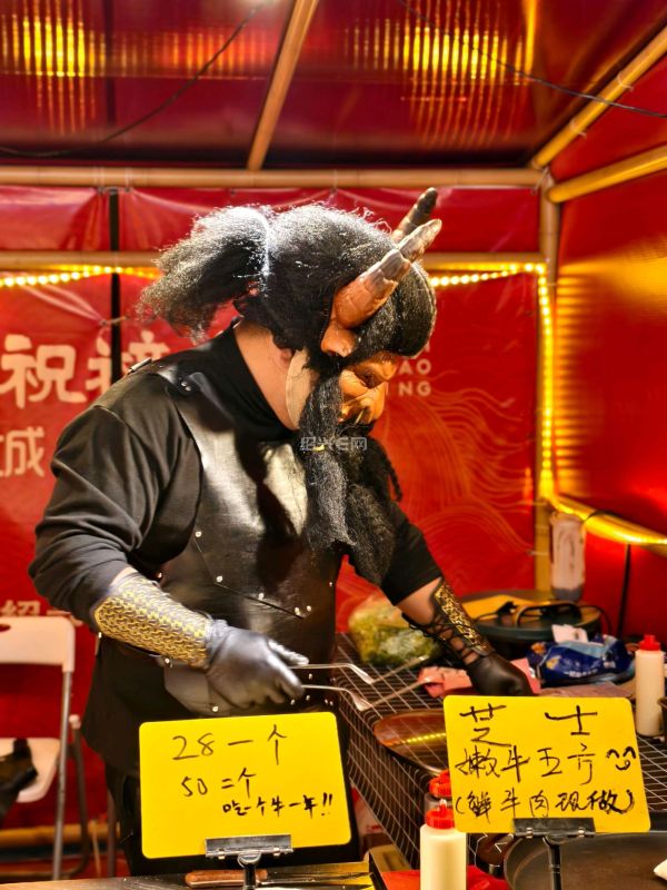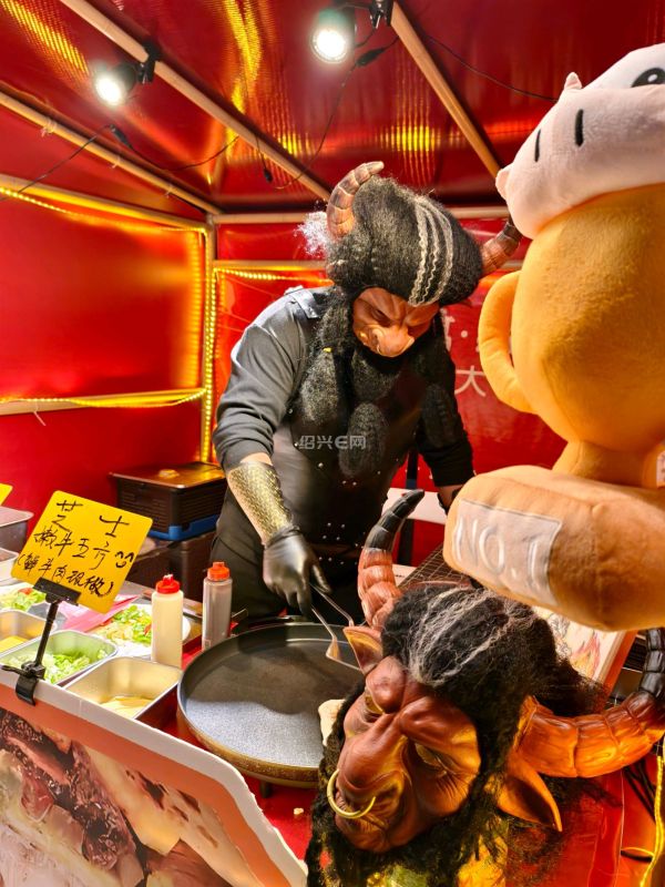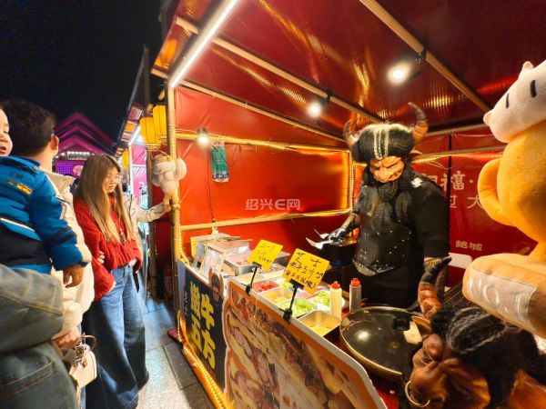 绍兴城市广场新春集市上,“牛魔王”摊主现身小吃摊,独特扮相搭配小吃,成集市网红打卡点,为市民游客增添了浓浓年味与趣味体验。