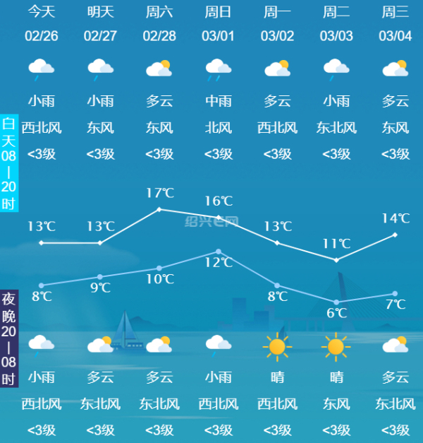 伴随着开工节奏雨水也悄然登场刚刚过去暖意融融的春节不少市民已经提前感受到春天的气息实际上,越城已于2月20日悄然入春,较常年平均入春时间(3月6日)提早了15天。在近10年入春记录中,仅比2021年2月19日的最早入春时间晚1天。天气预报越城区气象台2月26日6时发布短期预报今天阴有雨,部分雨量中到大,明天阴有时有小雨,夜里起雨止转阴到多云。偏东风2~3级。今天最高气温:12~14℃,明天最低气温:10~11℃。森林火险等级:二级,森林火险气象等级较低。后天阴到多云,后半夜转阴有小雨,9~19℃。