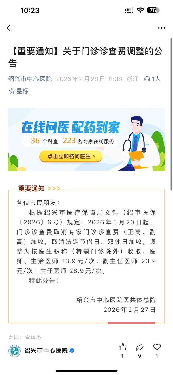 绍兴市中心医院公众号推送,看到门诊费按照职称收取,以前都是10元普通每次 专家15每次,现在调整一下比绍兴市人民医院都贵了?绍兴人民医院普通门诊也就10来元,一个中心卫生院是真没钱赚?