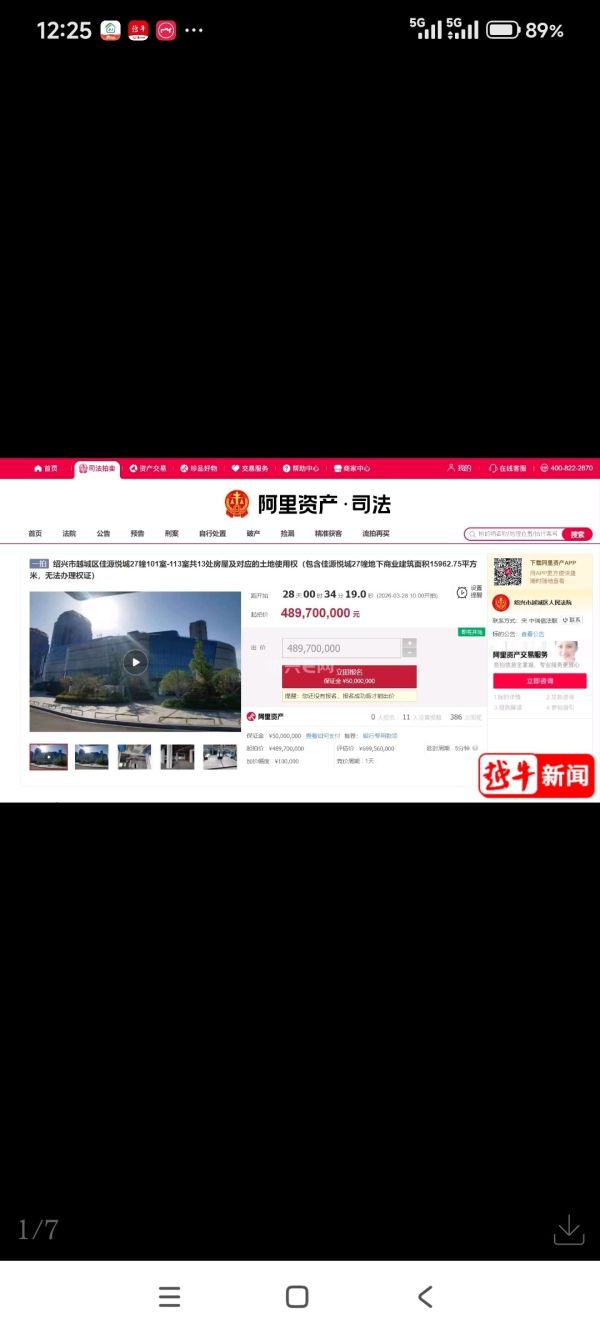 根据拍卖公告,3月28日,绍兴市越城区佳源悦城27幢101室-113室共13处房屋及对应的土地使用权将进行首次拍卖。本次拍卖权利来源为司法裁定,起拍价为4.897亿元。