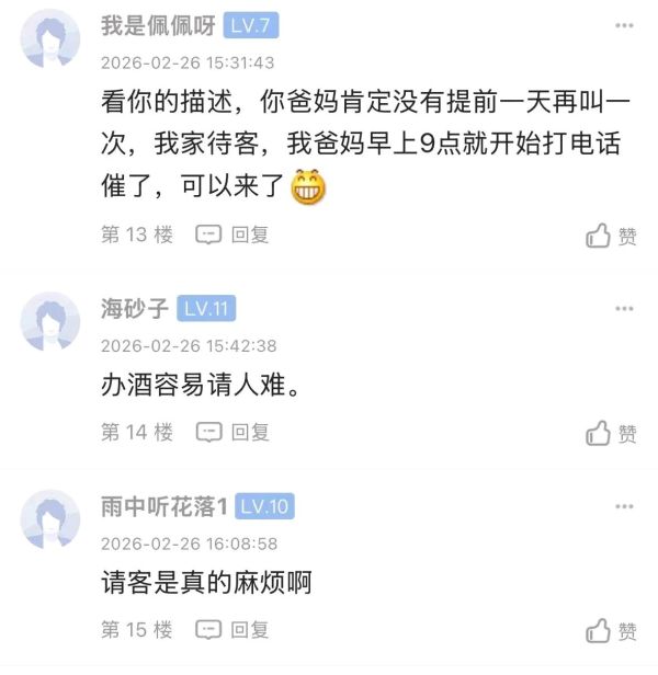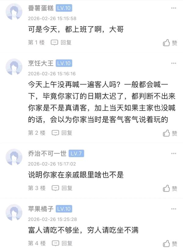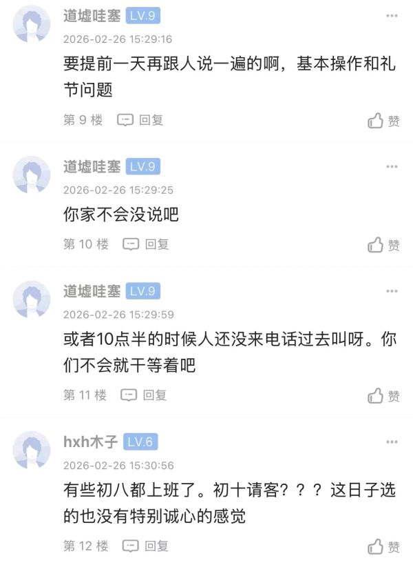 初十中午请客,也是很奇葩的,觉得亲戚们都不用上班是不是?就算提前确认,一般也不好意思直接拒绝吧,肯定到时候的借口就是临时有事没法去了。