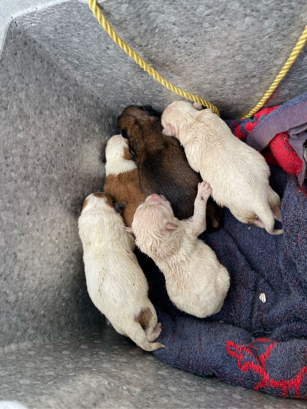 一个破车棚里有5只无主刚出生的小狗,找人领养,大狗不回来了