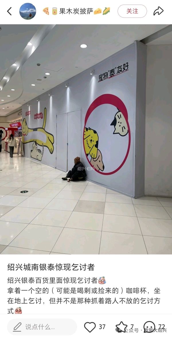 近日一位网友爆料说:绍兴银泰百货里面惊现乞讨者!拿着一个空的(可能是喝剩或捡来的)咖啡杯,坐在地上乞讨。观察了两分钟,发现不少路过的年轻人和学生群们,还是会施舍一些东西,有刚买的食物或饮料。有些也会从包里翻出硬币放到乞讨者那个杯子里…