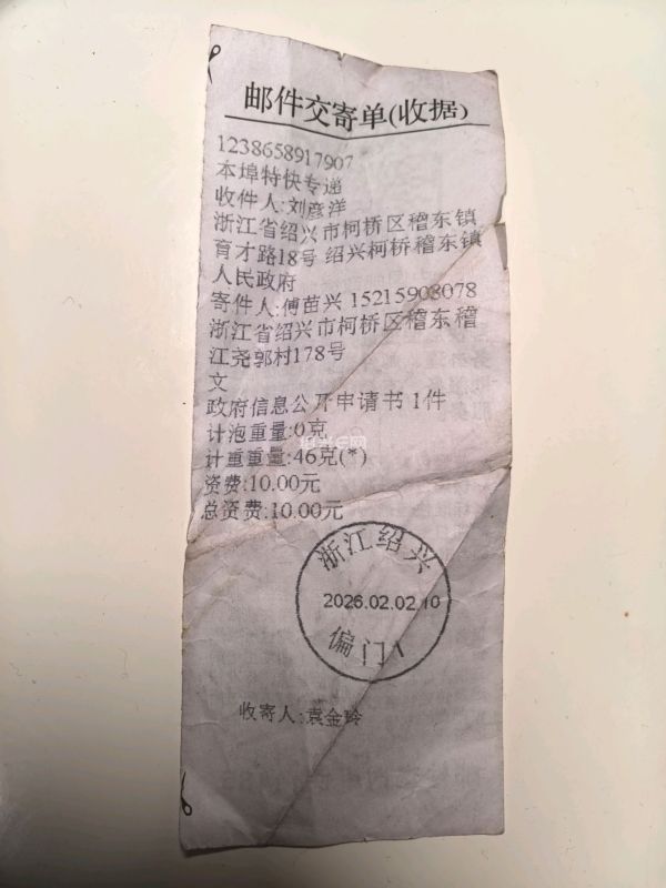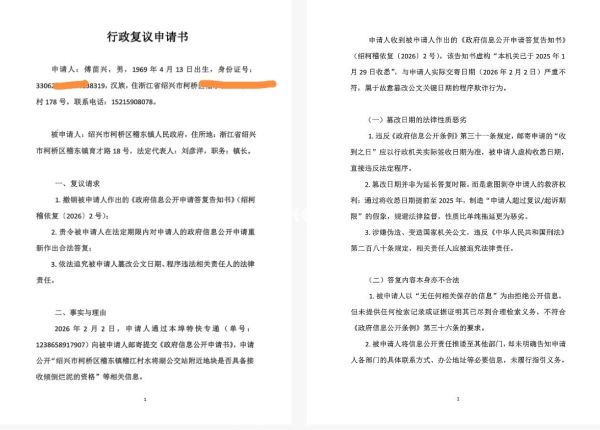 作为一名普通公民,我于2026年2月2日通过本埠特快专递,向绍兴市柯桥区稽东镇人民政府提交了政府信息公开申请,要求公开“稽江村水将湖公交站附近地块是否具备接收倾倒烂泥资格”等相关信息。然而,收到的《政府信息公开申请答复告知书》(绍柯稽依复〔2026〕2号),却让我对基层政府的公信力产生了深深的质疑。