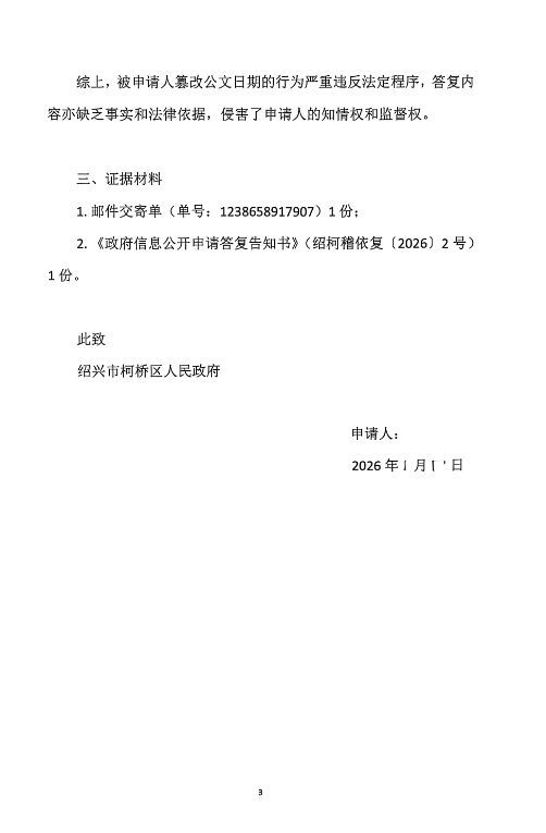 这份公函最令人匪夷所思的,是其公然篡改公文日期的行为。告知书中明确写着“本机关已于2025年1月29日收悉”,但我手中的邮件交寄单清晰显示,这份申请是在2026年2月2日才寄出的。一个政府部门,竟然在代表自身公信力的公函上,将收文日期提前了整整一年,这种低级错误,已经远远超出了“不严谨”的范畴,更像是一种刻意的程序欺诈。