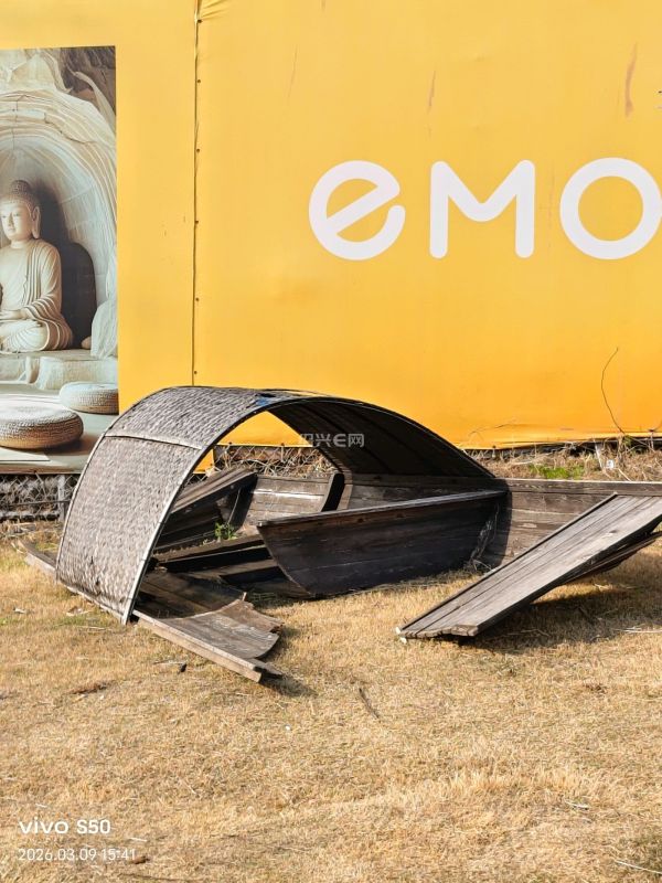 柯桥上羊山攀岩馆西边,在建(已开始营业)的羊山秘境的围档外,一艘疑是景物的木质小船已经破败不堪,有碍观瞻,建议换新的或者直接清理掉。