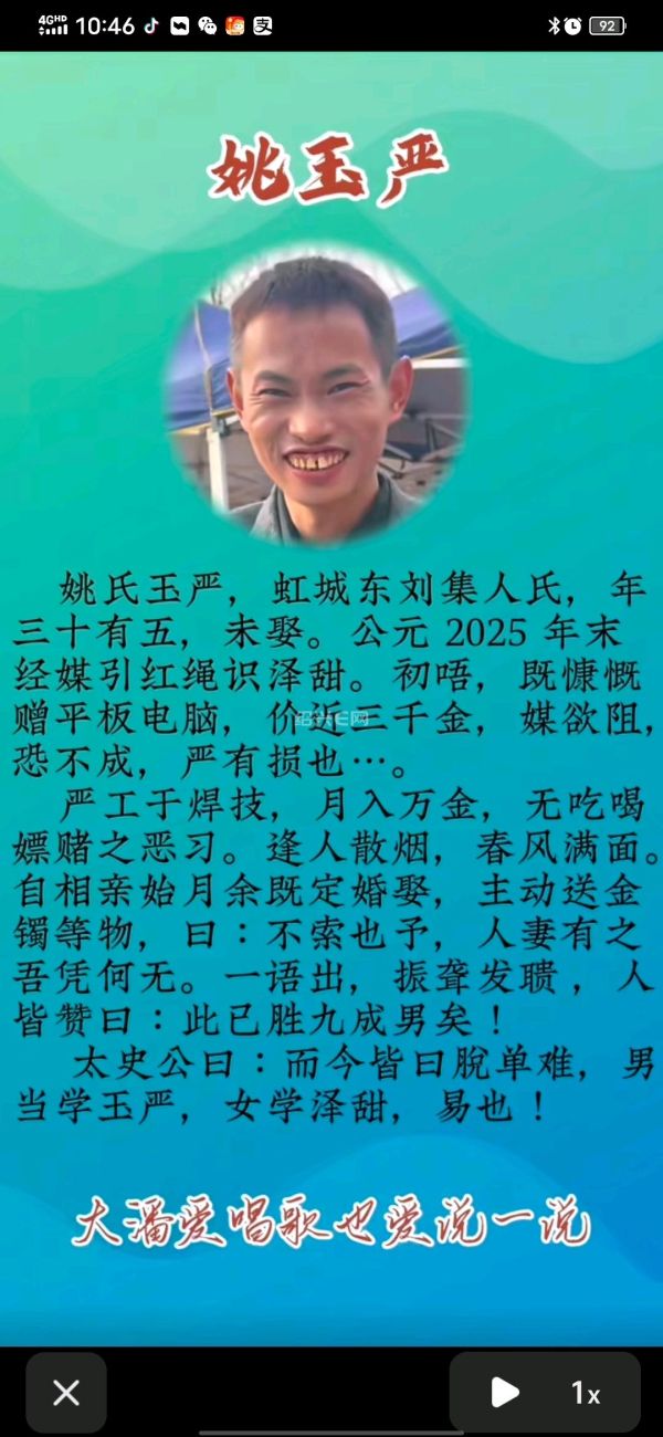 而今皆曰脱单难,男当学玉严,女学泽甜,易也!