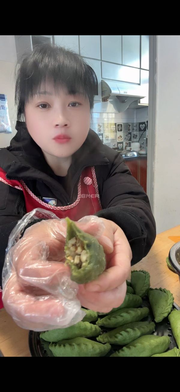 心灵手巧美娇娘,碧绿艾饺满口香。