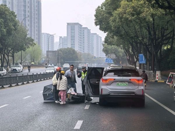 今天早上8点,柯桥中学南门附近,电车和电瓶车相撞