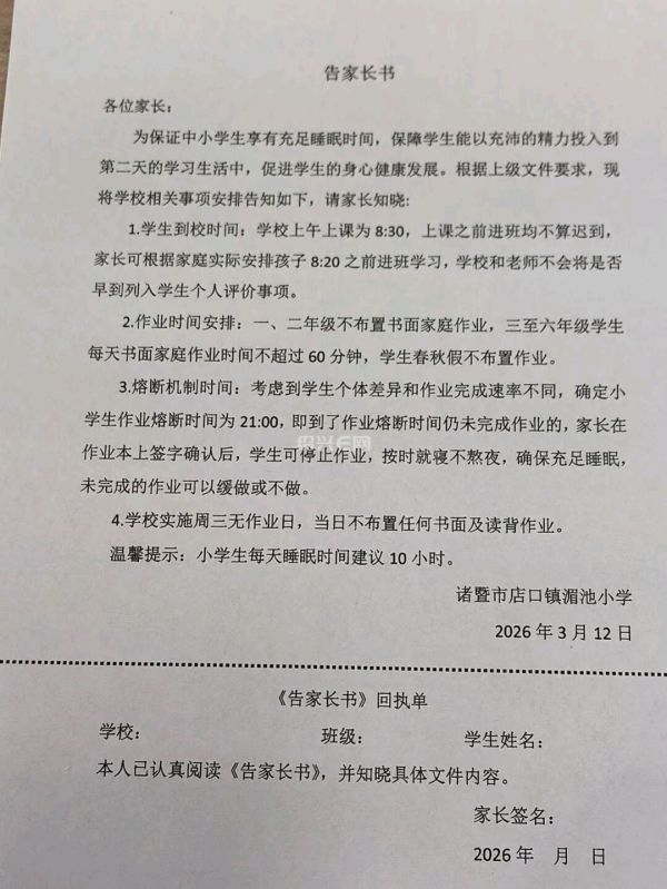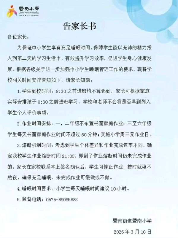 从网友晒出的通知中可以看到,暨南小学、湄池小学等学校已陆续发布相关安排。其中明确,学生早上8:30前进班不算迟到,每周三为无作业日,21:00之后也可以不写作业。