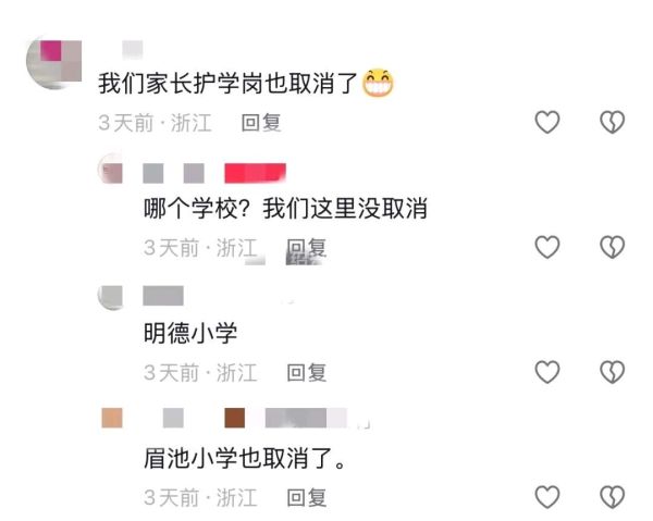 除了给学生减负之外,不少诸暨家长还反映,学校取消了家长“护学岗”。
