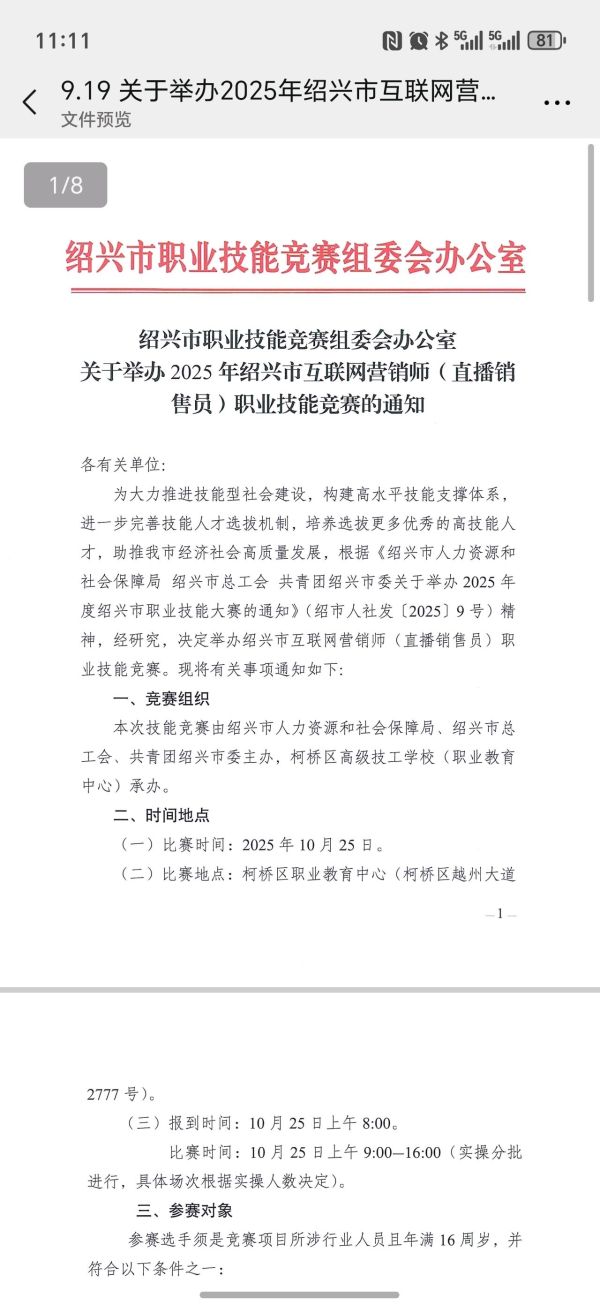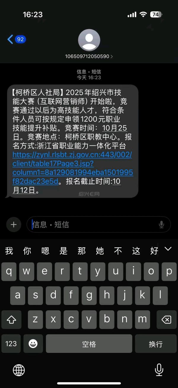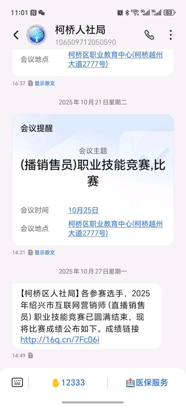我于2025年10月25日参加绍兴市互联网营销师(直播销售员)职业技能竞赛,考试前人社局是有短信通知,承诺通过考试可以领取1200元职业技能提升补贴。考试结束直到今天,我并未收到任何关于可以申领补贴的电话或短信,询问人社局和职教中心,两边开始互踢皮球,人社局说要问职教中心的老师,职教中心又说他们只保管了证书,补贴的事情不清楚。