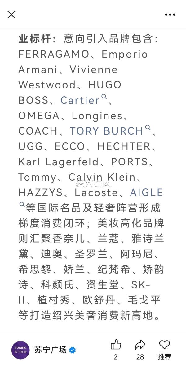 苏宁很努力看得出 但是这些品牌 还是不够打银泰 高化一个也进不了 高化不进意味着很多对标得品牌也不会来 这块银泰拿捏。零售目前公布出来 也没够到轻奢这级 个别店 翻不起风浪 没有成片进场的话。 餐饮这些只能说中规中矩 看开出来口碑了
