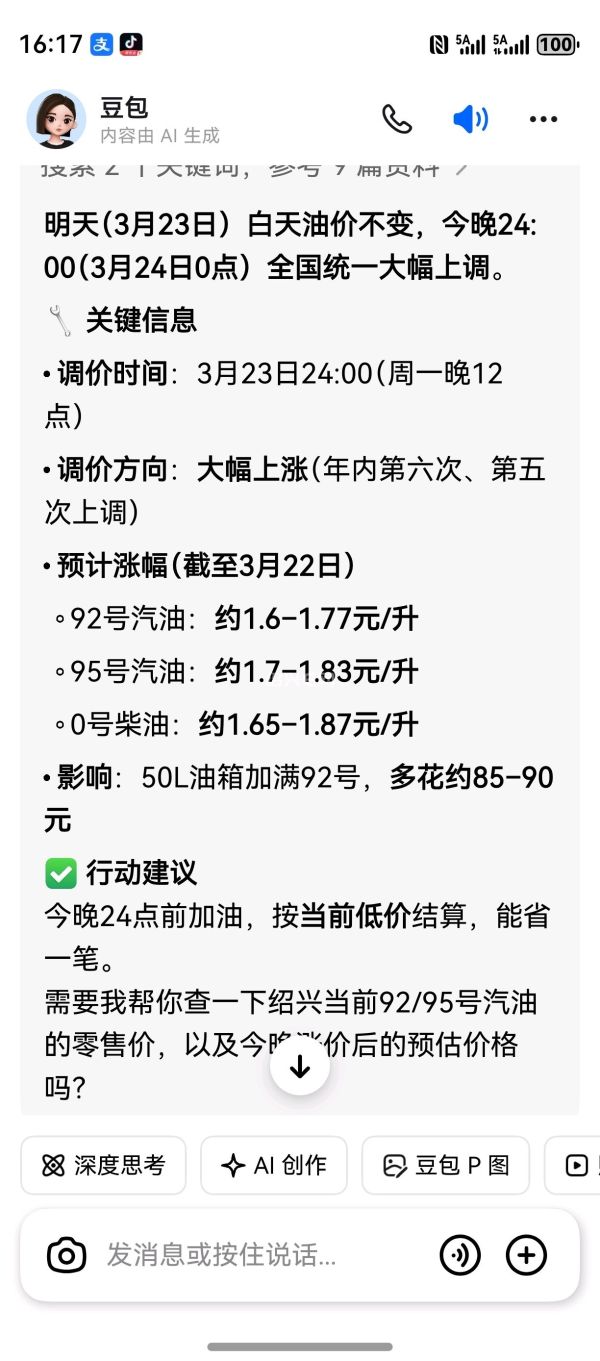 鱼傲天际:那可不是一点钱,涨一块多呢,50-60升油箱也有小100呢 (2026-03-23 08:01)