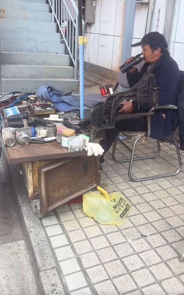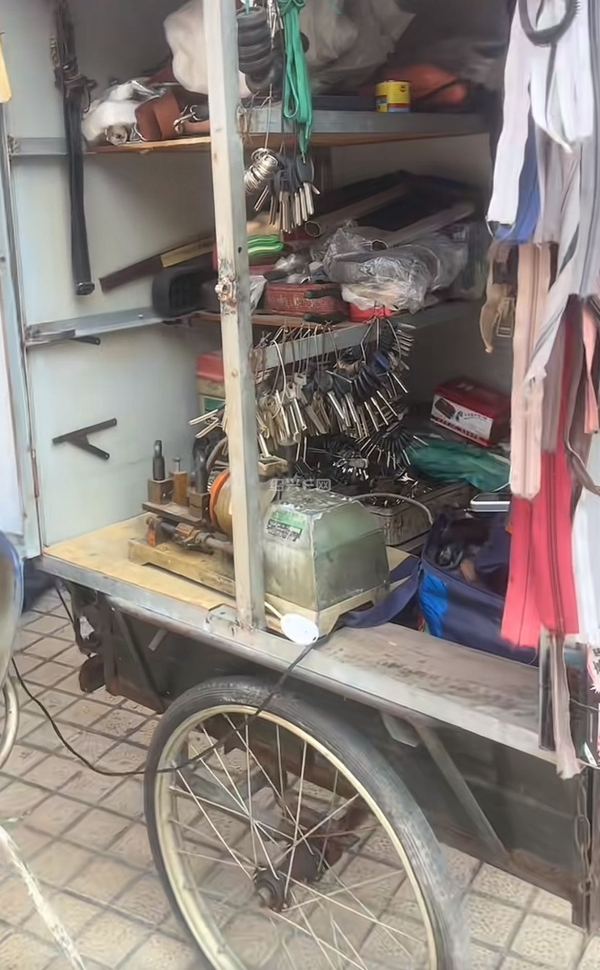 遮阳伞下的工作台上放着砂轮机,割槽机,钻孔机;边上的移动的三轮车车厢里面,挂满了各种各样不同大小的钥匙配件;中间的位置上,一位戴鸭舌帽的师傅正靠坐在沙发喝水等生意。前几天在市区内看到的修锁配钥匙的老手艺,曾经遍布市区的大街小巷,只是现在真的很难看到了。