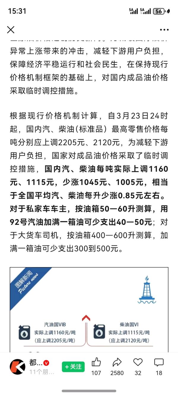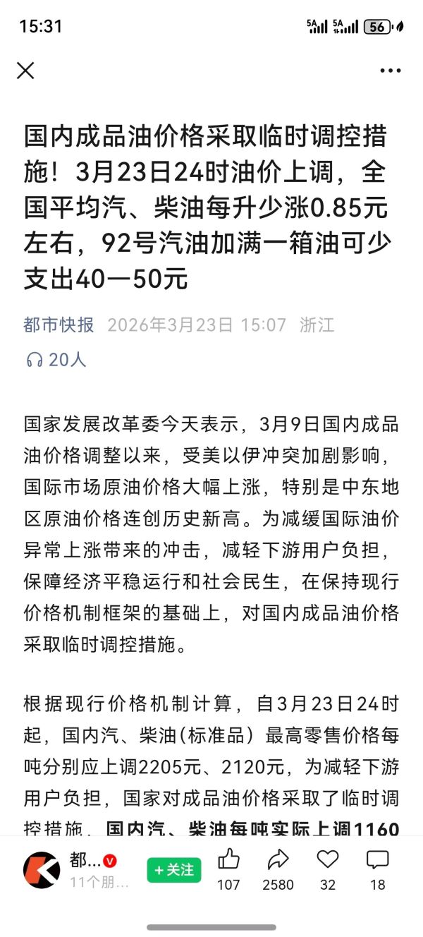 回 第12楼(美丽星空)的帖子 美丽星空:涨价是和国际原油接轨的,平时关注下也可以自己算的,又不是只有今天放出来消息的。 (2026-03-23 16:27)