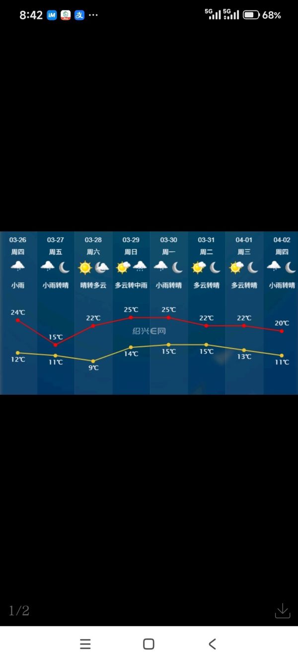 绍兴明天多云到阴,下午起转阴有雨。暖湿气流再度活跃,后天阴部分有阵雨,下午起雨渐止转多云,不过最高气温有一个转折,在弱冷空气的渗透影响下将跌至15℃左右,随后又有所升温。