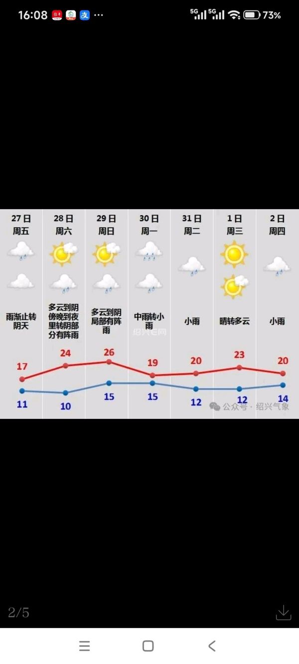 今天上午阴有阵雨,中午雨渐止转阴到多云,明天多云到阴,傍晚到夜里转阴部分有阵雨,出行建议随身携带雨具。未来七天绍兴晴雨转换较为频繁,气温小幅波动、变化较快。