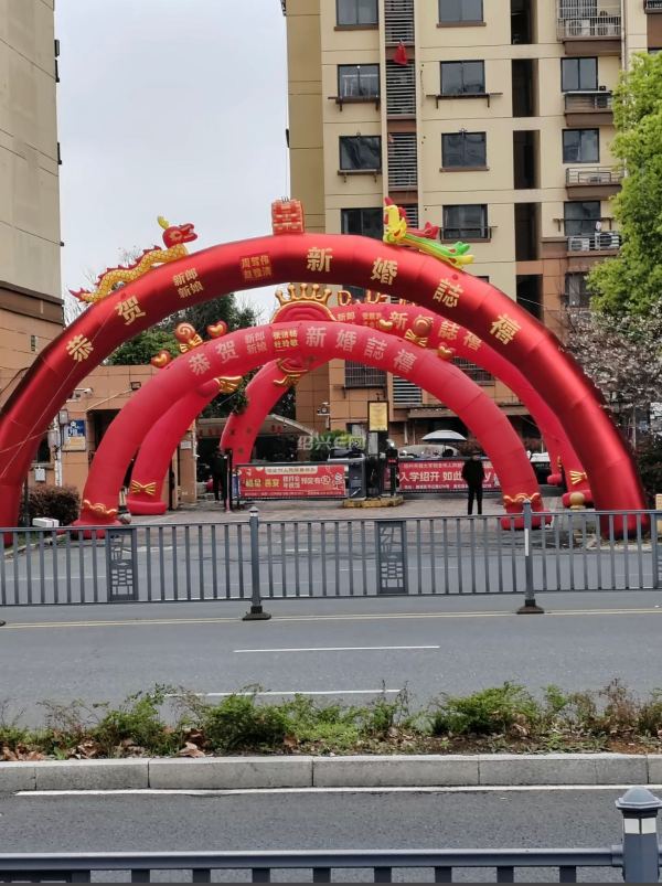 东湖街道滋江家园门口,四座高大的气拱门前后排开,看起来非常喜庆。据边上的一位男子介绍,该小区今天有四位新人同时结婚。祝福他们!