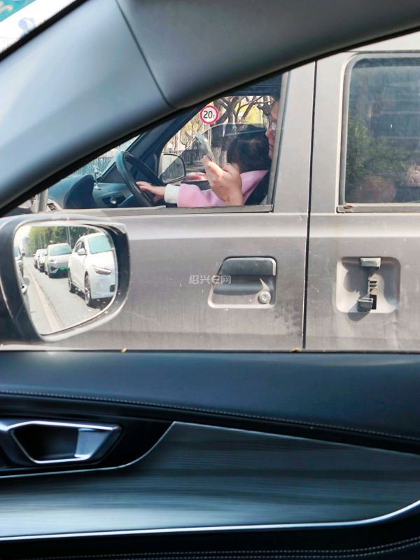 他把小孩放身前,坐他腿上,在驾驶室啊,用安全带固定,还单手看手机啊!