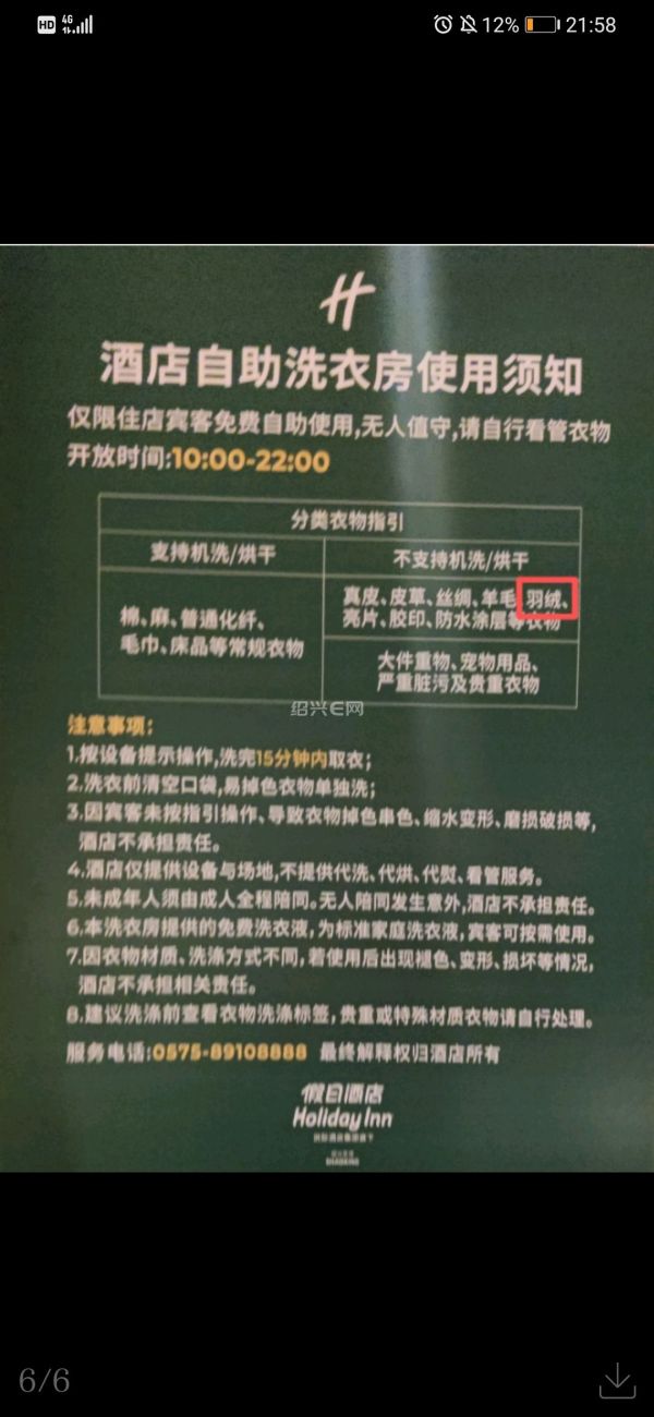 事件发生后,记者在酒店5楼洗衣房看到,新的“使用须知”已张贴上墙,使用时间从“24小时”调整为“上午10点至晚上10点”,并明确在“不支持机洗/烘干”一栏中,增加了“羽绒类”。
