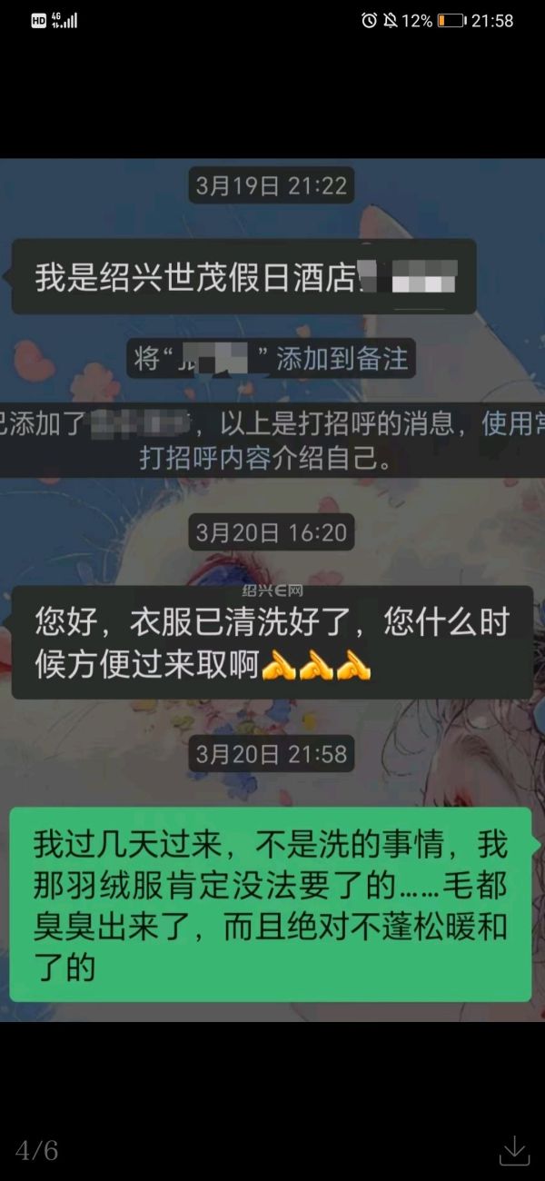近日,王女士向越牛新闻反映称,自己3月18日入住绍兴世茂假日酒店,当晚在酒店自助洗衣间清洗一件羽绒服,并嘱咐酒店员工“将洗好的衣服烘干后送到她房间”,没想到拖到19日晚上她才拿到羽绒服,而且羽绒结块,潮湿发臭。更令她难以接受的是,随后的维权过程演变成了一场与酒店方的激烈冲突。