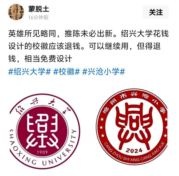 说抄袭言过其实了,小篆的“兴”字本来就是上下左右四个爪子,沧州的基本上照抄小篆,绍大的中间变形加入了“名士”,更凸显了绍兴作为名士之乡的象征,意味完全升级了。