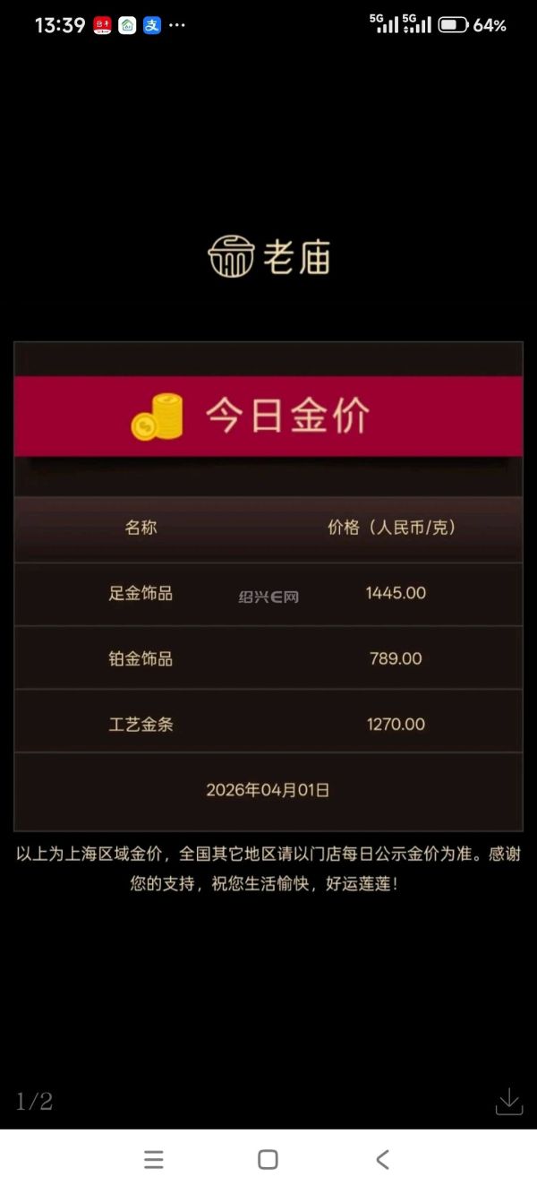 周大福、老庙黄金、周大生足金饰品报1445元/克,较前一日涨50元;周生生足金饰品报1447元/克,较前一日涨47元;老凤祥足金饰品报1448元/克,较前一日涨40元。此外,周六福报1440元/克、六福珠宝报1443元/克。