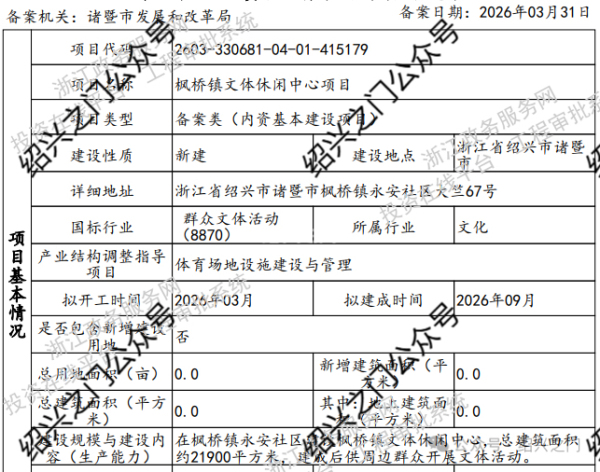刚刚发布,10万枫桥人终于盼来了!? ?4月1日,枫桥镇文体休闲中心项目备案。在枫桥镇永安社区建设枫桥镇文体休闲中心,总建筑面积约21900平方米,建成后供周边群众开展文体活动。