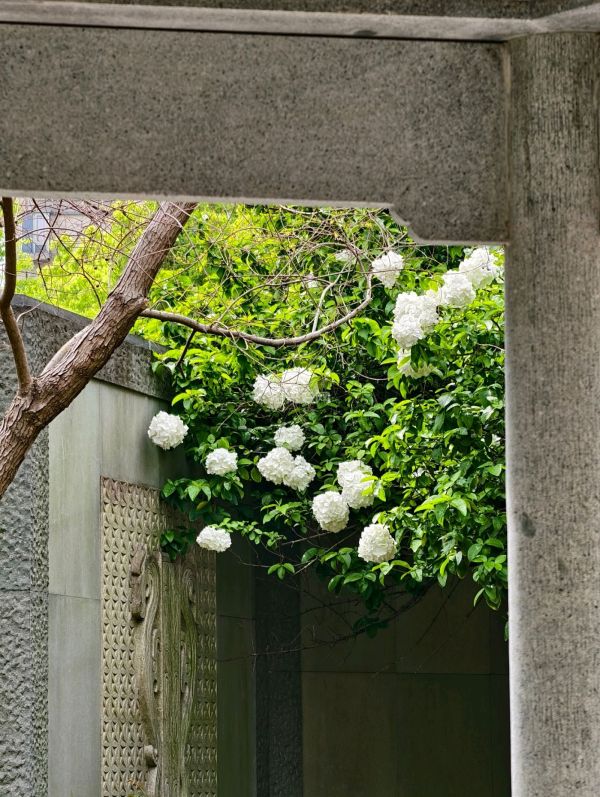 走进西施山公园只见一球球的绣球花开了,绿色的树叶衬托这白色绣球花非常漂亮