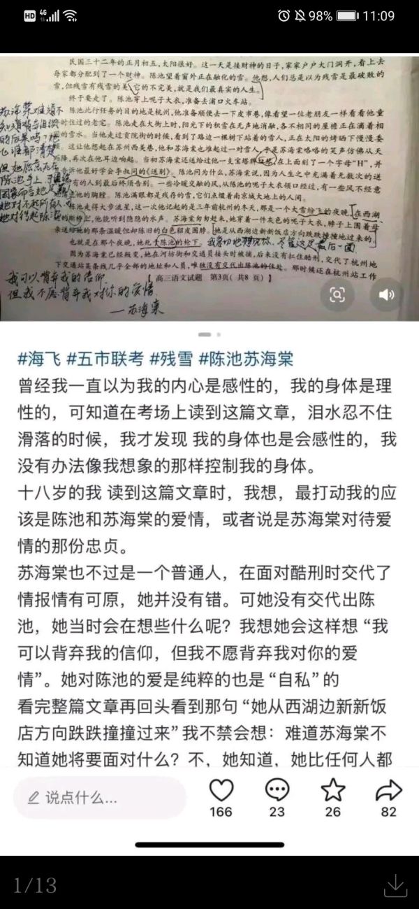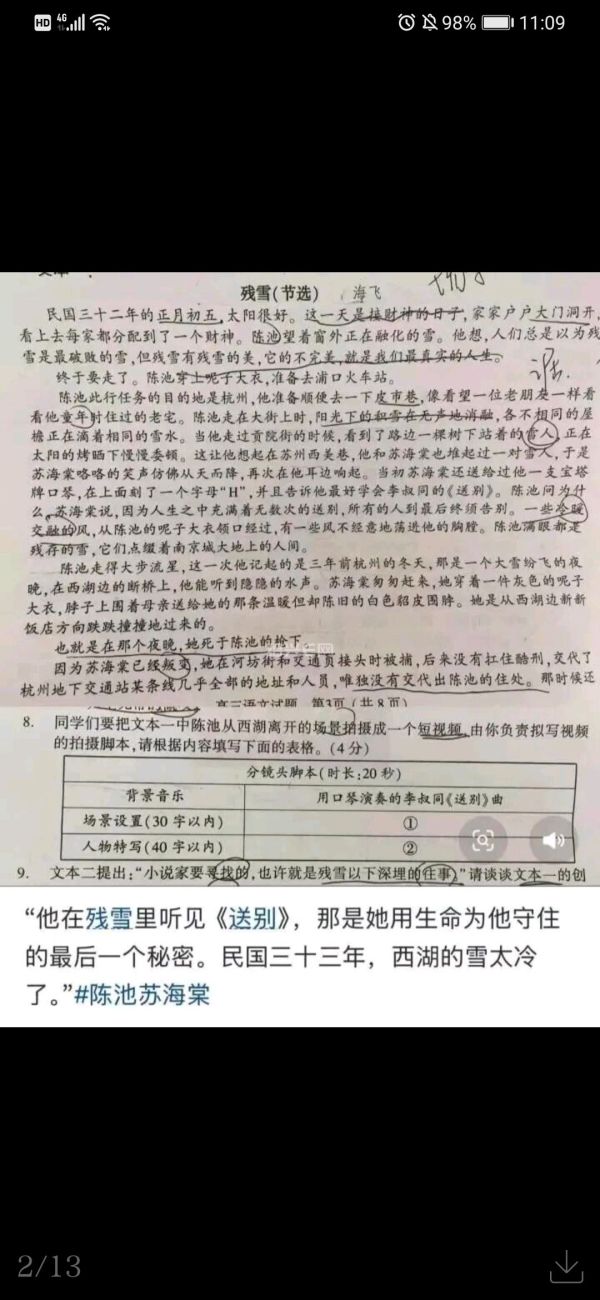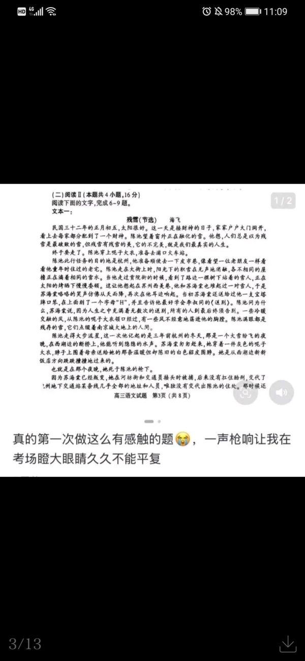 因为评论区不断有留言涌入,海飞才后知后觉,自己的小说《残雪》被节选进了河南高考一模语文试卷。