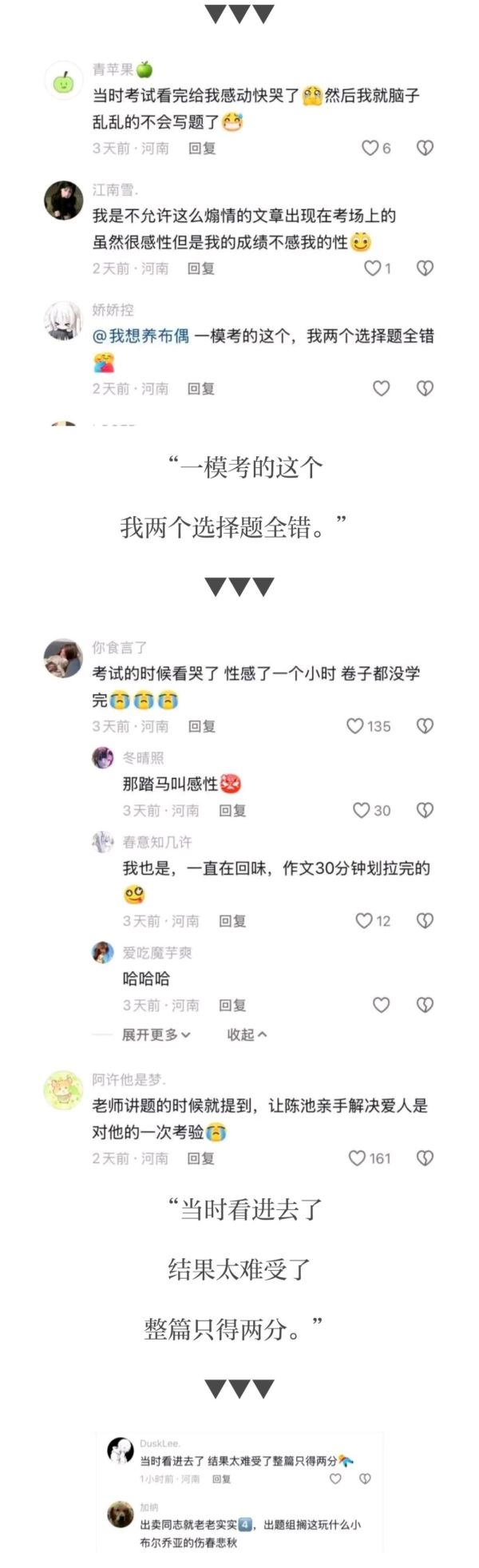 也有不少考生吐槽,因为文章太煽情,故事太感人,导致心情太难受了,答题来不及——
