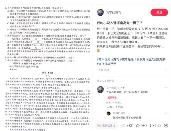 有不少考生在网上喊话作者海飞,求答案。但海飞在个人社交平台亲自作答后,也上演了“翻车”,最终得了4分:“我自己都只有50%的正确率”。