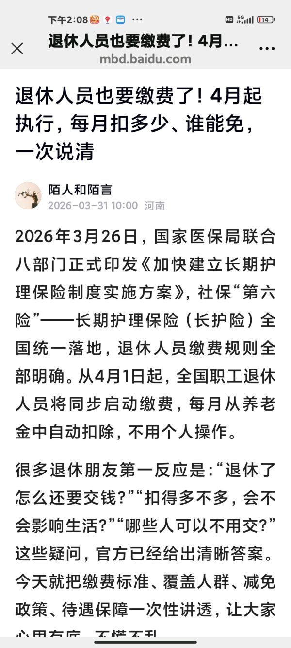 早上刷手机看到一则网友的披道:从四月开始要从全国退休人员每月退休金中直接扣除0、15%元作为国家养老保险《养护险》个人缴费,特困及五保户困难家庭免扣。是国家为解决低收入困难老人失能养护而推出的养老保障险。这是真的嗎?有没有官方正式文件向老百姓宣传一下。