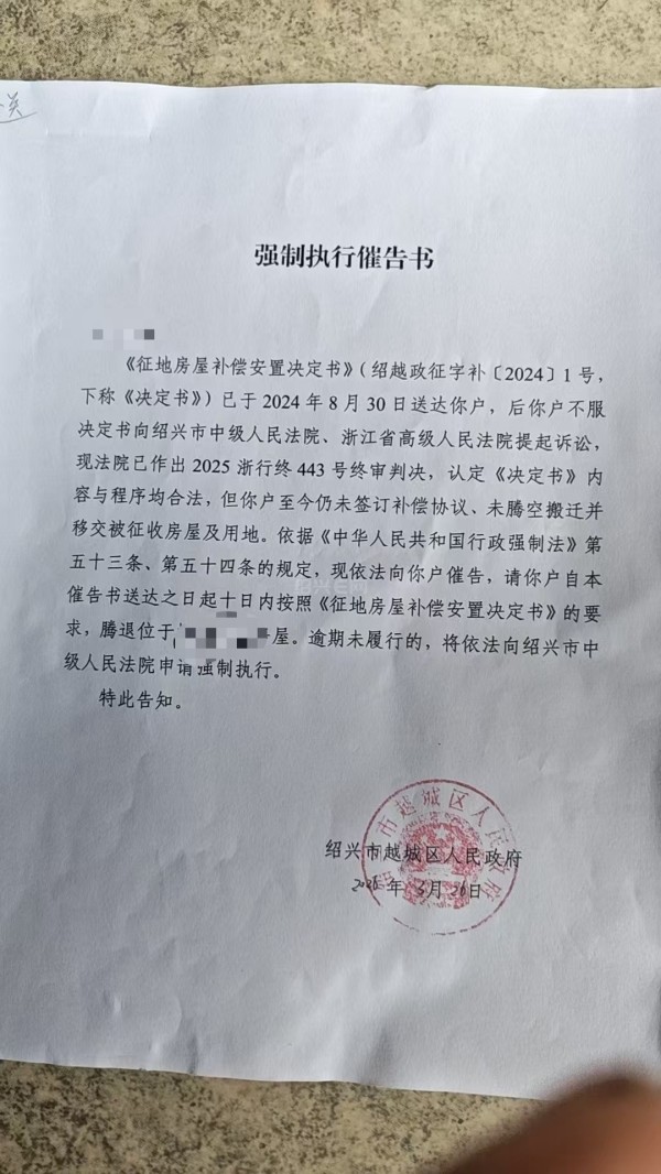 2、根据《党政机关公文处理工作条例》,公文是党政机关在行使职权、处理公务时形成的具有法定效力和规范体式的文书。行政机关依据《行政强制法》等规定发出的催告书,属于履行法定职责的正式文书,具有行政效力,符合公文定义 ,应当有行政文书编号。但越城区人民政府3月26日作出的《强制执行催告书》并没有公文编号,怎么保障公文作出程序规范、可追溯???