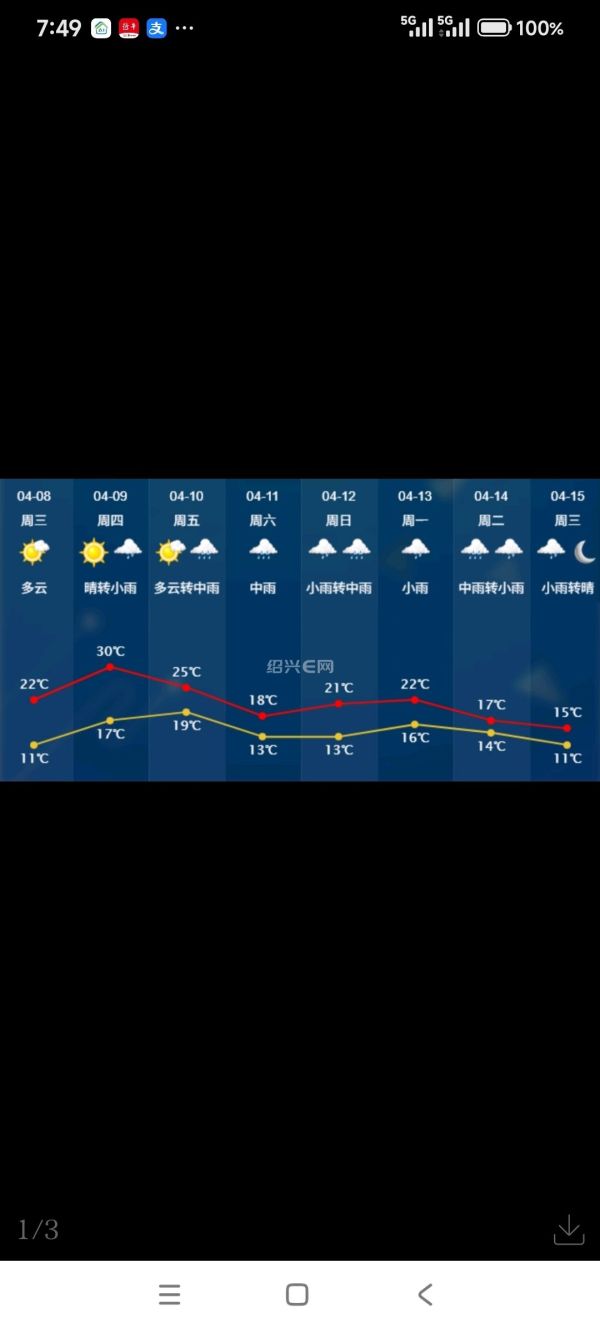 今天是清明小长假最后一天,受弱冷空气影响,绍兴天空云系逐渐增多,由多云转为阴天,部分地区会出现短时阵雨,雨量分布不均,出行时建议随身携带雨具,以防突发降雨。今天最高气温26~27℃,比昨天偏低3℃左右。明天多云,夜里转阴局部有阵雨。明天最低气温14~15℃,比今天偏低4℃左右。