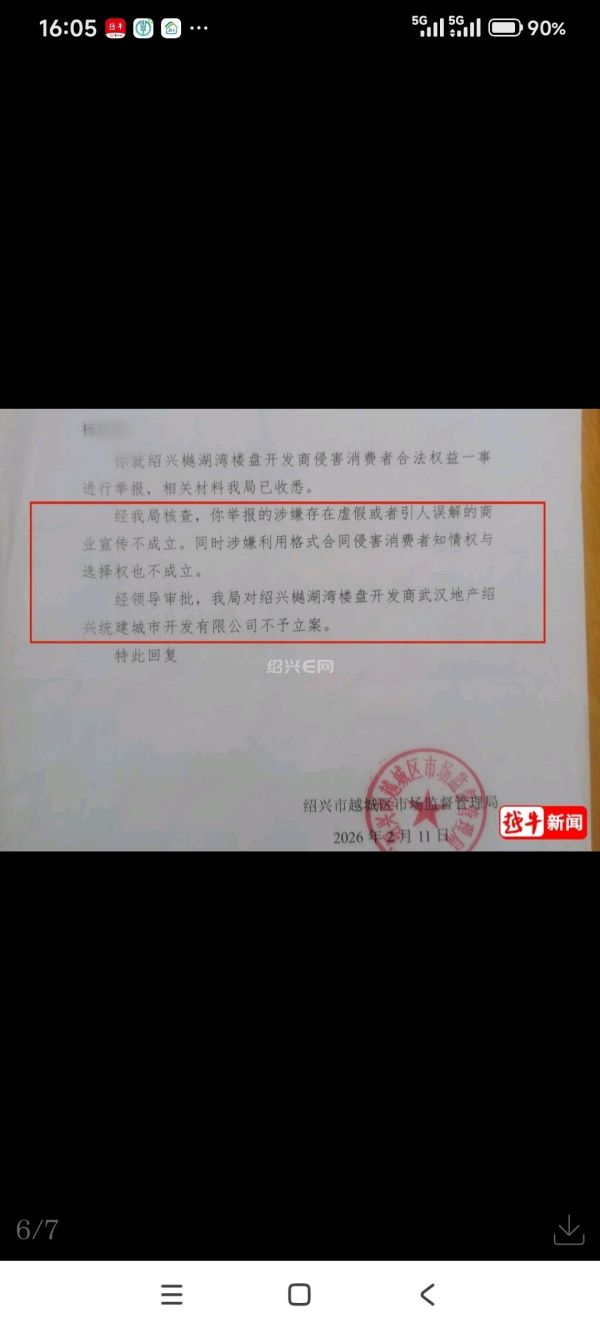 然而,该局反馈称:经核查,涉嫌虚假或者引人误解的商业宣传不成立;涉嫌利用格式合同侵害消费者知情权与选择权也不成立。最终,经领导审批,决定对开发商——武汉地产绍兴统建城市开发有限公司不予立案。