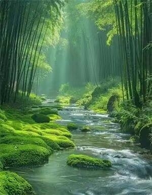 翠竹透晨曦,苍苔映碧漪。