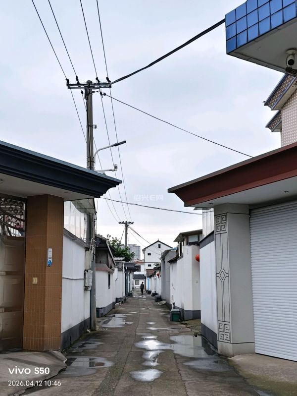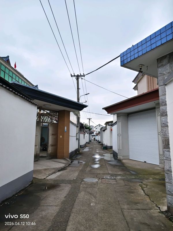 骑车路过一村道,属于前后两排自建房的中间,前排房子的后院墙与后排房子的前院墙,本来勉强可以通过一辆消防车的,但两家的门头盖特别大,估计高大一点的车通不过吧。